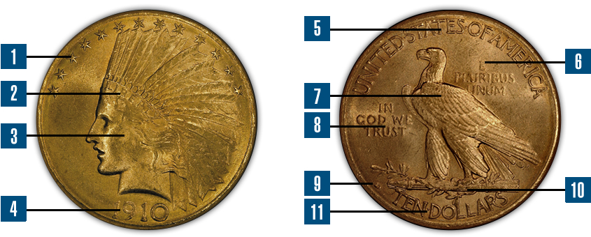 - 11. The legal tender denomination of "TEN DOLLARS" is inscribed along the bottom rim of the coin's reverse.