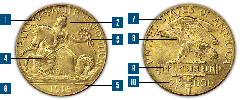 - 1. The commemorative designation of "PANAMA-PACIFIC EXPOSITION" appears in raised-relief around the upper rim and sides of the obverse design.