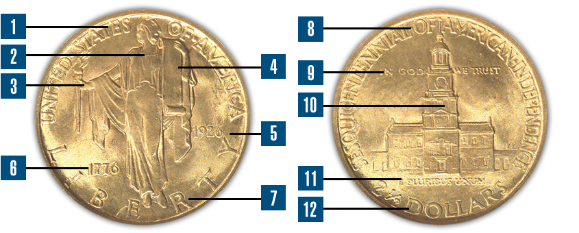 - 5. Near the far right of the coin's obverse is the mint year date of "1926," which is the sesquicentennial date of America's independence from England.
