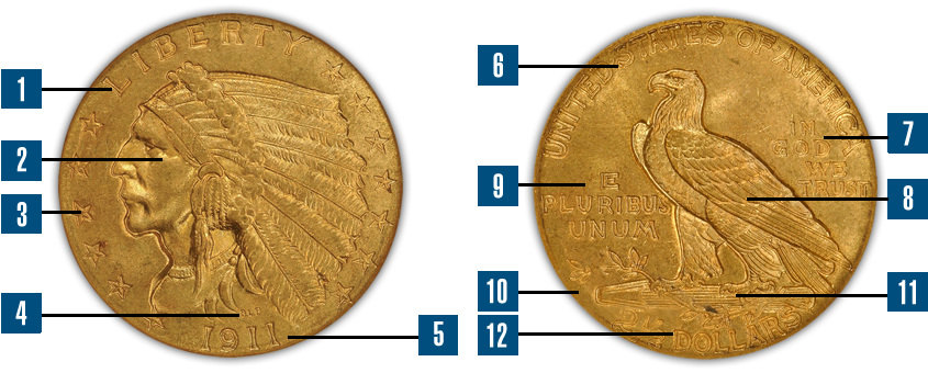 - 12. The legal tender denomination of "2 1/2 DOLLARS" is inscribed along the bottom rim of the coin's reverse.