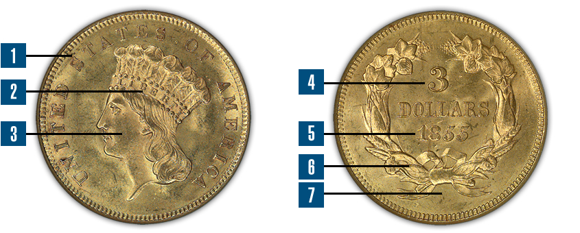 - 4. The legal tender denomination of "3 DOLLARS" is inscribed just above dead center of the coin's reverse.