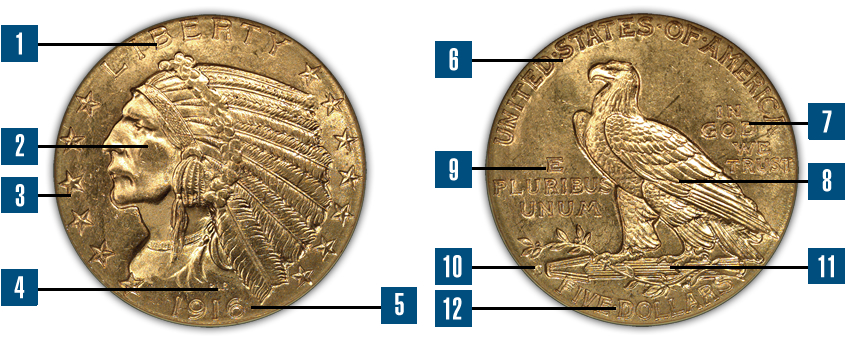 - 2. The obverse features the first realistic depiction of a Native American Chief in war bonnet ever used on a U.S. gold coin. Like the other devices on the coin, the Indian figure is incuse, meaning sunken rather than raised.
