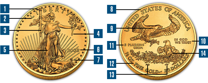- 12. Along the Gold Eagle's reverse bottom rim, raised-relief inscriptions denoting the gold weight and legal tender denomination appear.