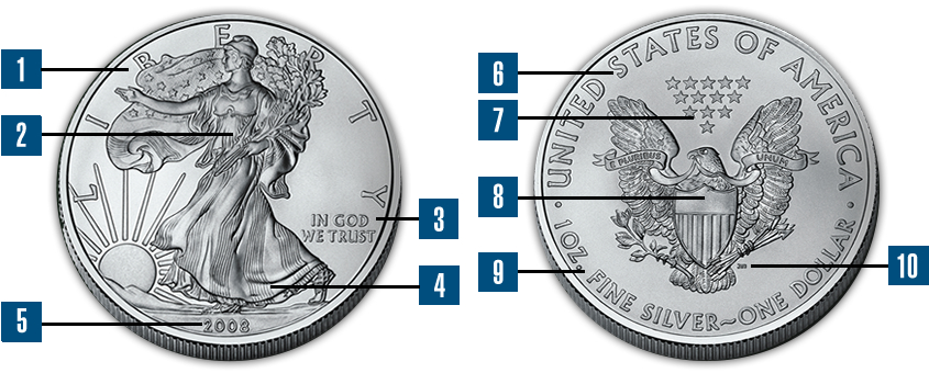 - 1. The obverse of the Silver Eagles is based on Adolph A. Weinman's classic "Walking Liberty" half dollar design, which has the motto "LIBERTY" appearing in raised-relief spaced around the top half of the obverse's rim.