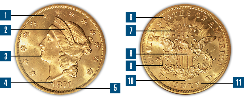 - 7. Beginning in 1866, for the first time ever in U.S. $20 gold coin designs, the motto "IN GOD WE TRUST," which is located near the top center of the reverse, is used.
