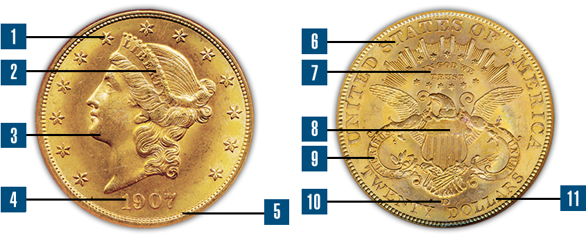 - 4. In the Liberty Double Eagle design, the mint date for a particular coin is located at the bottom center of the obverse.