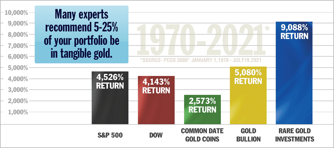 For 50 years, Rare Mint State Gold Coins have produced an impressive 9,088% return for investors and collectors - far outperforming the S&P 500, DOW, generic gold coin index, 3000 coin index as a whole and gold bullion prices, according to a highly-respected Mint State Rare Gold Coin Index from 1970 - 2021*.