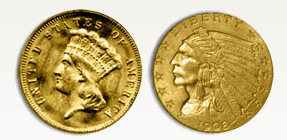The second area in our Select Four comprises four Indian Head gold coins minted periodically from 1854-1933. The coins recommended in this area are the $3 Indian Princess, the $10 Indian Eagle, the $5 Indian Half Eagle and the $2.50 Indian Quarter Eagle.