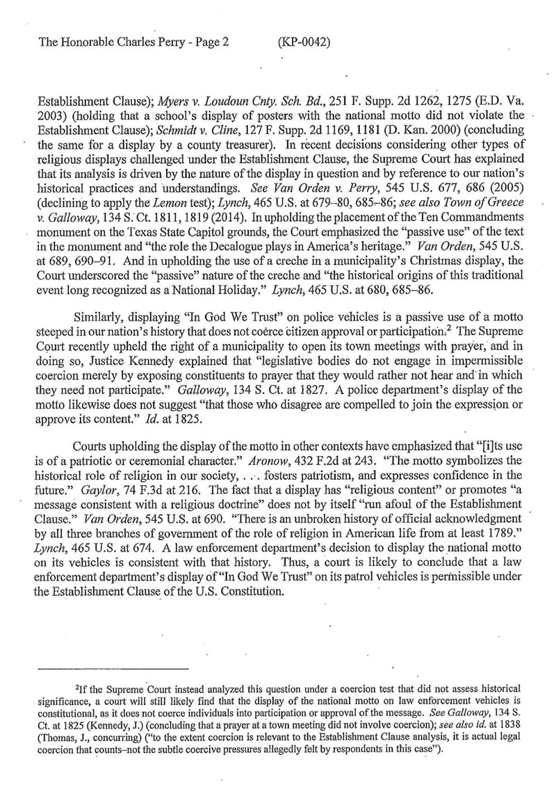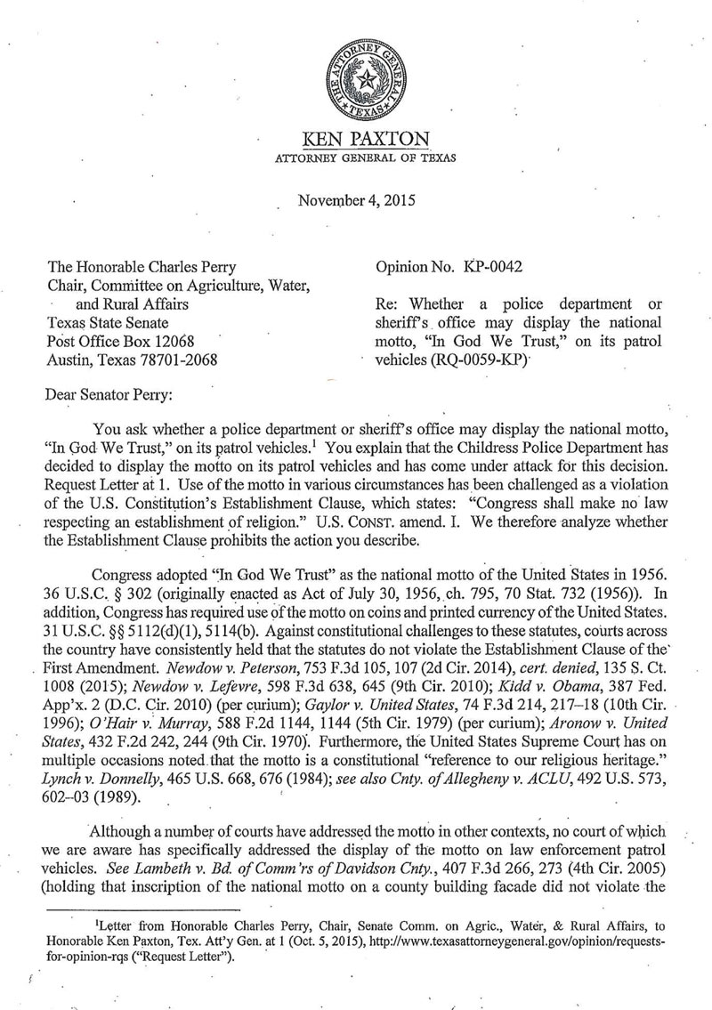 Texas Attorney General Ken Paxton was asked to render a legal opinion about a plan to display “In God We Trust” on police cars in one Texas town. He responded this way: “A court is likely to conclude that a law enforcement department’s display of the national motto, ‘In God We Trust,’ on its patrol vehicles is permissible under the Establishment Clause of the United States Constitution.”