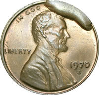 In 1970, a different kind of error involving “In God We Trust” appeared on small numbers of Lincoln cents made at the San Francisco Mint. Part of the steel on one or more dies had broken off, causing metal to flow into the empty space this created on each coin when it was struck. As it happened, the resulting blob of metal – known to collectors as a “cud” – covered the words “We Trust” along the top edge of the obverse (or “heads” side) of each coin, leaving only “In God” visible.